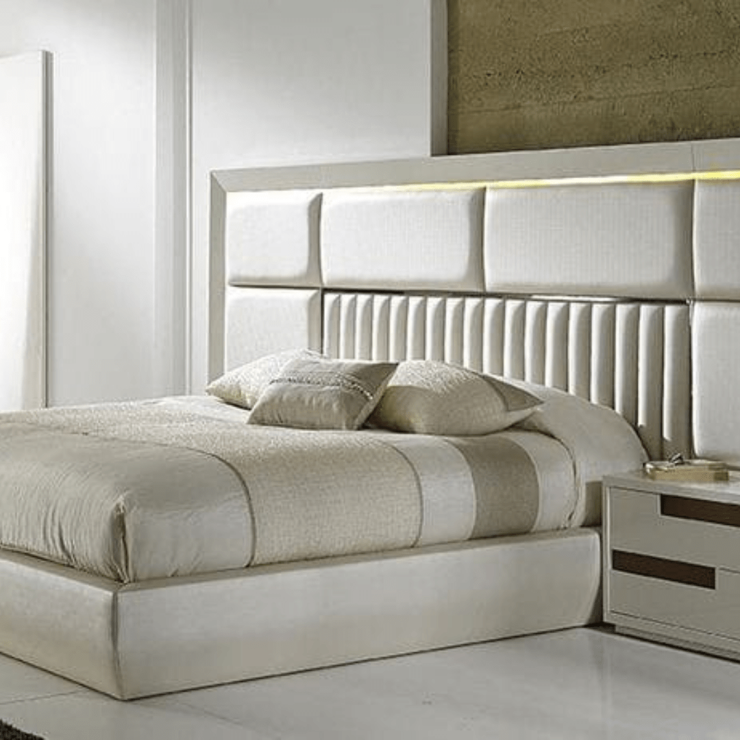 Upholstered Beds are covered in light padding and fabric which gives a textural appeal; they could be made with velvet, leatherette, suede or simple fabric upholstery and typically have tufted or straight streamlined headboards.